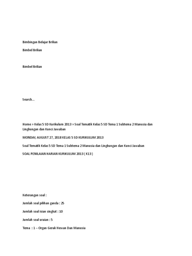 Soal tema 6 kelas 5 revisi 2017 ini juga . Kunci jawaban soal ulangan tematik Berikut ini contoh soal pts/uts tema 2 kelas 5 semester 1 kurikulum 2013 terbaru untuk tahun ajaran 2018/2019. Soal sudah dilengkapi dengan kunci jawaban. Jumlah soal pilihan ganda :